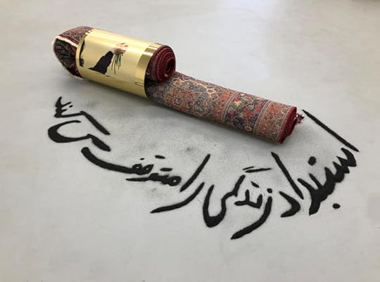 Tyrrany stops life., 2109, Iranian rug, silica grit, aluminum, archival ink jet print, polyester film, dried tulip petals