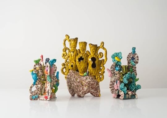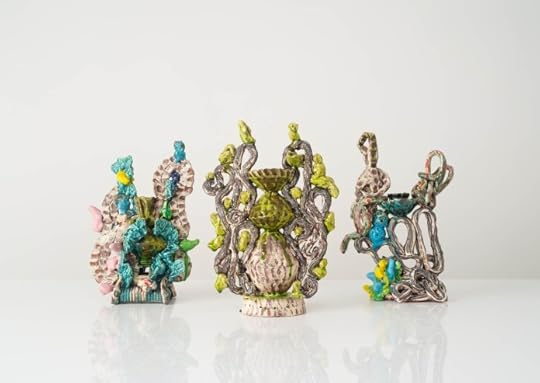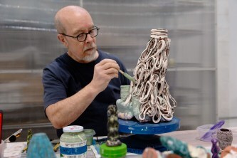 Graham Marks produces exuberant, coil-built ceramics adorned with vibrant glazes, which combine functionalism with visual delight. Of late, Marks has embraced loose, sinuous forms from which coils of clay spill in dynamic and improvisatory compositions. His candelabras and flower vases contain a wild energy all their own, full of brash, linear abandon. In their merging of pattern and embellishment, they recall the intricate crafts of eighteenth-century France, bringing rococo flourishes to the timeless theme of utilitarian vessels.
