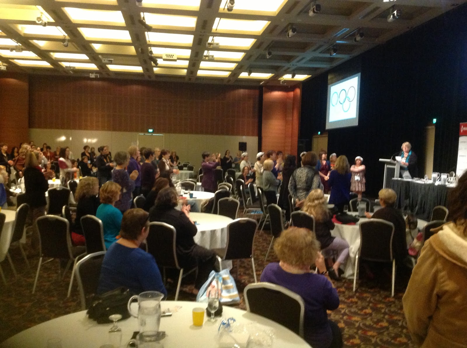 The "Stand ups..." with Anne GracieInto plenary for the wind up. A few final words from guests Kim Hudson and Sarah Wendell and the announcement of next year's conference in Sydney (7-10 August 2014...get it in your diaries NOW). Best part of the weekend "the stand ups" orchestrated by Anne Gracie. "Stand up if you...published a book/submitted a manuscript/entered a contest" etc. Always gives me goose bumps! An evening of social catch up which I won't go into...suffice to say I shall be glad to be tucked up into my own bed tonight :-)Thank you for the comments and joining me vicariously in Perth. Until next year :-) Can't wait.