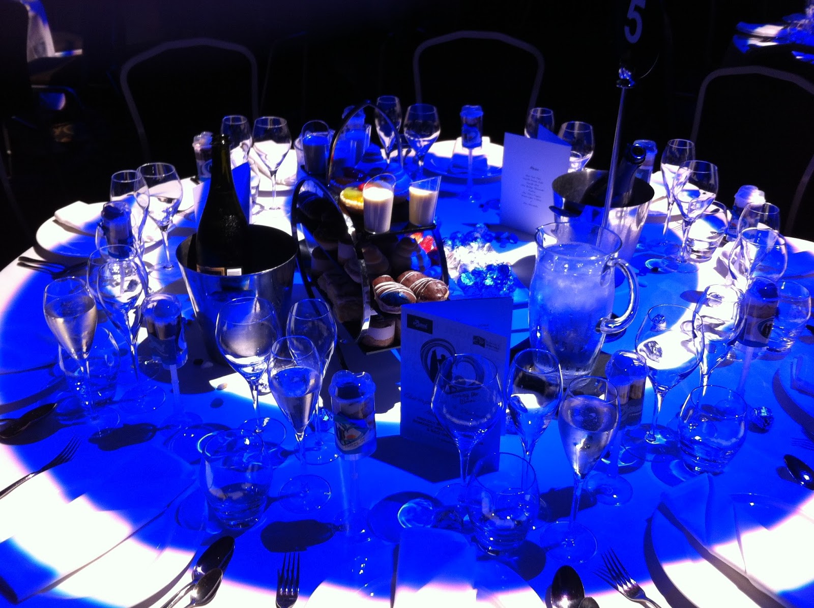 Pretty tables :-)The room looked stunning with blue swirly spotlights over tables groaning with rich desserts and Baci chocolates. I don't have that much of a sweet tooth and I have to admit, having been awake since 4.00am and surviving a workshop, a roundtable and my traditional role at the AGM...I was actually quite weary! Our little writing group celebrated Sasha Cottman's First Sale