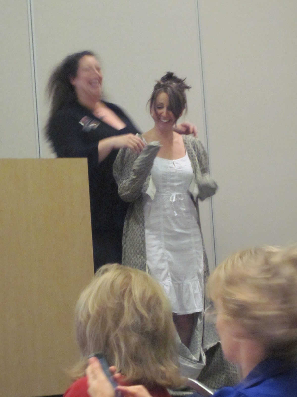 The first challenge was to don my gown without the aid of my abigail. I was forced to summon Ms. Lowe fresh from the Literacy signing to safety pin me into the dress.