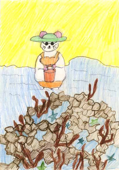 Chestnut goes rockpoolingWhen we got home, I wrote the story up and in the days before self publishing, printed and bound several copies for the family. I was only reminded of it the other day when T (now a gorgeous young woman) mentioned it in conversation with the added suggestion we should dig it out and publish it. I don't think so... but it did bring back memories of a happy week with three gorgeous kids and two mice.