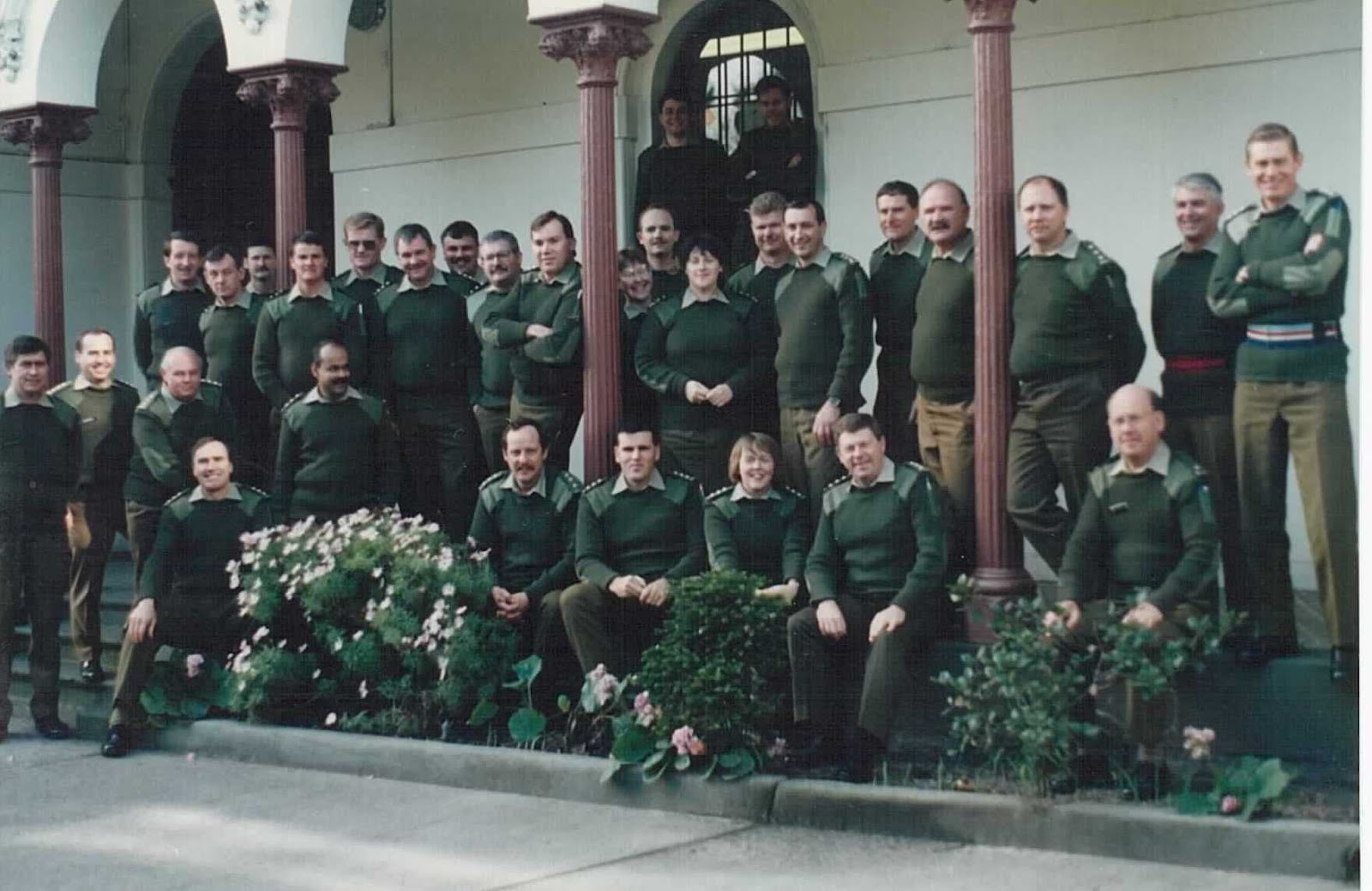 Alison, seated front row middle, outside Netherby 1992The sergeant lived quite a distance from Queens Road so he began the practice of sleeping overnight after the Wednesday night parade. The first night he did this, he chose a small, quiet room at the rear of the building. About 3.00 am he was woken with a start. The room was icy cold, despite a heater that was still on. Struggling to focus, he had the distinct impression of a figure at the foot of the bed staring down at him. He leapt out of bed, switched on the light and with his heart in his mouth did a tour of the house. The room and the building were deserted. He never slept in that particular room again but chose instead another room affectionately called "Netherby Hilton Suite 69". 3 Training Group was in the throes of moving and this meant that during the day only one or two of the regular staff were present. One of the officers worked with him in the orderly room for company in the large empty building. On one occasion the Major brought his dog to work. The dog dozed contentedly in front of the heater. Suddenly and without warning the dog leapt up, heckles raised and began barking and growling at one of the pillars which extended from the front verandah into the orderly room. This continued for about 5 minutes before the dog returned to its slumbers in front of the heater. Both men jokingly began referring to the third resident of Netherby as "Albert".