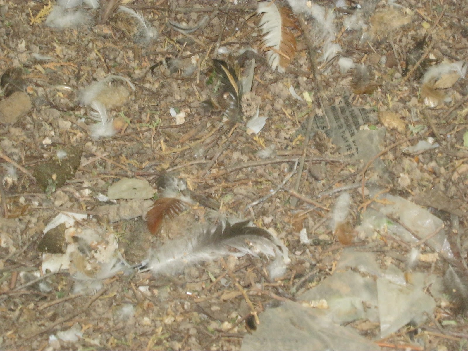 Tuesday: Other than losing some feathers, none of my chickens were hurt. They could have easily all been killed because neither I nor the dog heard their cries of terror. According to the record in the feathers, Aki the Cockerel--who was supposed to be a girl but ended up not being one--fought off the dog while the girls ran for cover. In my panicked, frantic searching, I found him sitting on top of them in a back corner of the coop quietly whispering comforts to the terrified girls. (I love my Aki.)
