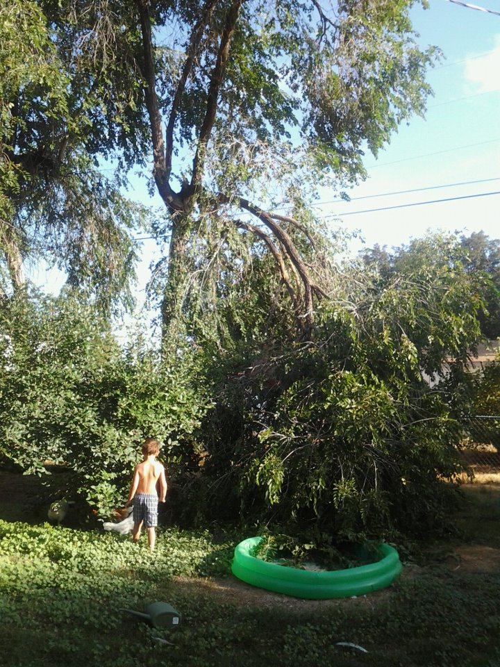 A very large tree branch on a very old elm tree had decided to commit suicide and fell down... kind of. It was still supported by the half of a branch below it and, well, the ground. (For scale, my son in the photo is 46" tall.) The chickens were very confused and immediately ran out, climbed into the leafy mess, and began scratching at it to try and clean it up.