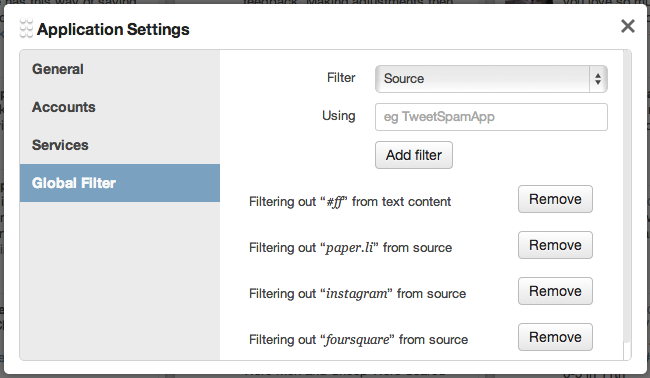 Though I bounce between TweetDeck, HootSuite, and even the Twitter app on my desktop, some new filters I’ve implemented on TweetDeck (not available on the other two) have made it much easier for me to stay sane and clean up my lists. Without further ado: