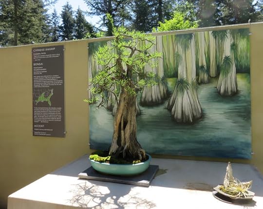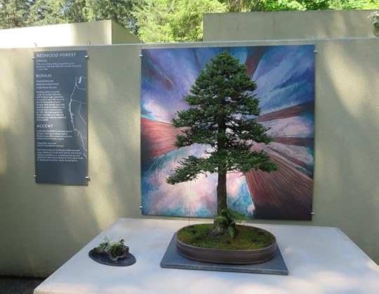 Although I enjoyed walking among the trees and around the lakes, my favorite part of the grounds was the Pacific Bonsai Museum, so I'll focus on that today. Each miniature tree is beautifully set in an individual outdoor display area with artwork showing its native habitat. A description board is posted nearby.