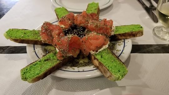This was one of the prettiest and most delicious dishes I had. The thinly sliced salmon reminded me of lox, served on bread that contains arugula (that gives it the green color), with a dollop of creme fraiche. It's served with ripe olives in the center and a splash of olive oil with herbs on the plate.