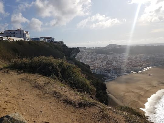 View of Nazaré from Praia do Norte, reputed to have the biggest waves in the world according to the Guinness Book of World Records. (Wikipedia link)