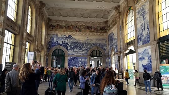 Tiles with historical themes cover the walls of the Sao Bento train station in Porto