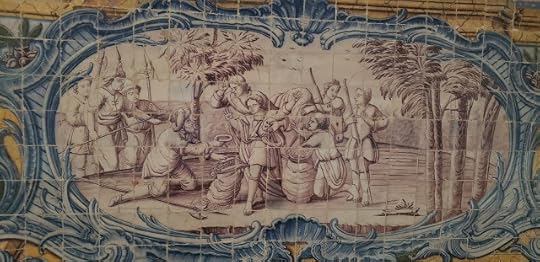 Tile murals depict scenes from the Bible inside the Jerónimos Monastery in Lisbon