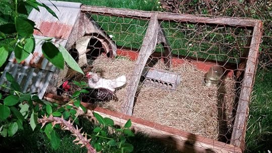 A chicken coop, complete with two real birds, added to the realistic design of this full-sized facade.