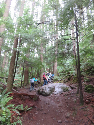I apologize for the fuzziness of this photo, but I'm pretty sure I was shaking from the "calf-burning" incline. The trail was steep, laced with rocks and tree roots, and slick with rain. Are we having fun yet?