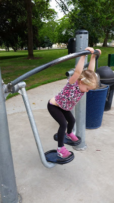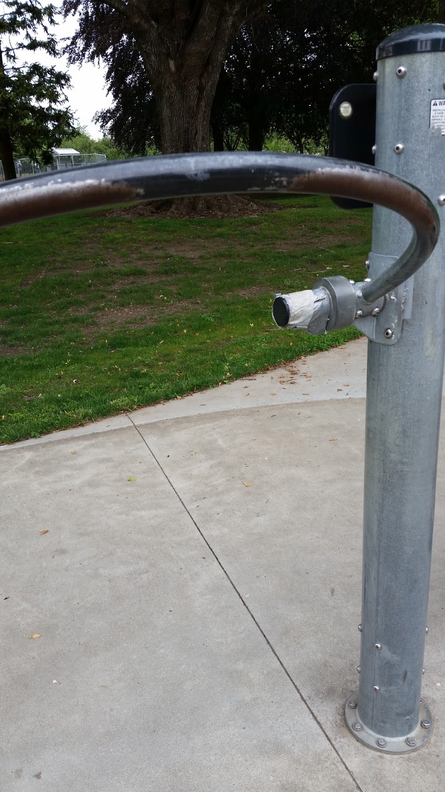 Left: My granddaughter playing on the fitness equipment. There were three like this. Now only one is still intact.Right: Damaged equipment with most of it missing.