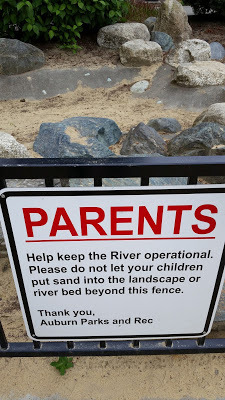 Left: The last time we came to this park, there were two swings - one plastic, made for infants and toddlers; the other for bigger kids. Now there's only one.Right: Obviously, the "river" is choked with sand. I'll admit this was an ill-conceived idea from the get-go. Not all kids who come to the park are supervised, and kids are surely going to get sand in the water if it's only steps away!