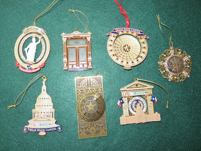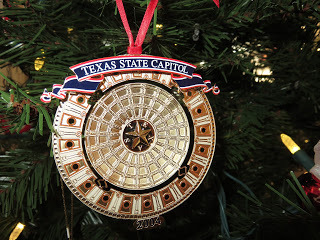 Over the years my husband's sister has sent our family special Christmas ornaments to remind us of our Texas heritage. Each item relates to the Texas State Capitol.