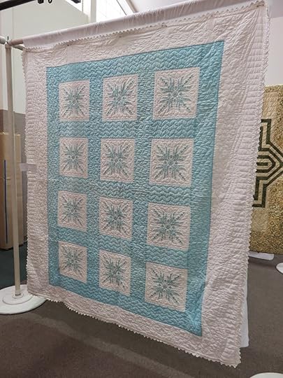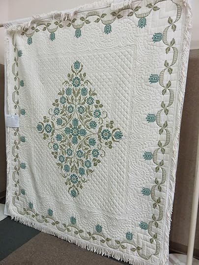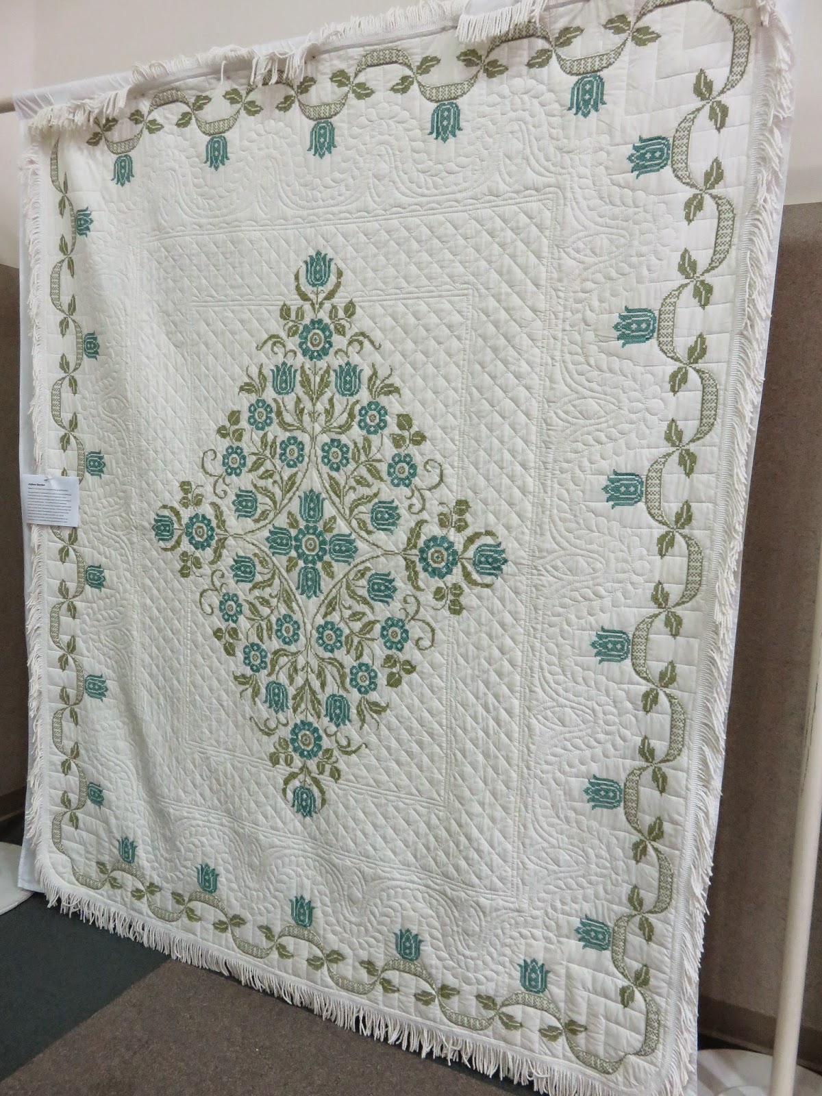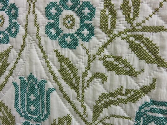 Beautiful cross-stitched whole cloth quilt. In a whole cloth quilt, the emphasis is on the stitching. Some designs include trapunto, a technique that involves stuffing certain areas of the motifs to add more depth.