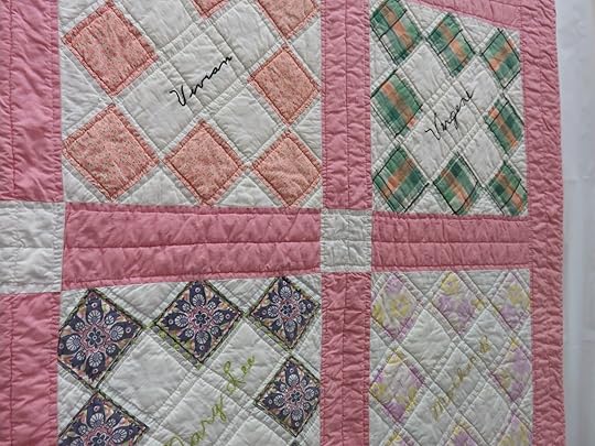 Here's a signature quilt, with each square signed (and embroidered) by the person who made it. QuiltingInAmerica.com says:In the mid-1800s, Victorian quilters began a popular tradition of making signature quilts, signed and quilted remembrances, to honor family members or friends. At a time when many loved ones moved away and seldom, if ever, returned home to see their families again, these quilts served as precious remembrances for those families who had only occasional letters to connect them with friends and relatives back home.