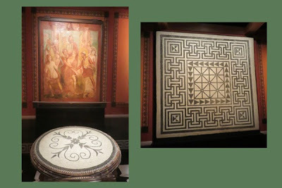 Beautiful mosaic table and section of floor, along with murals portraying life in Pompeii
