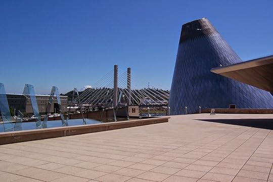 The distinctive stainless steel cone marks the museum's location.Mt. Rainier peeks over the hill in the background.