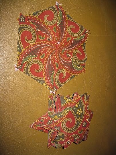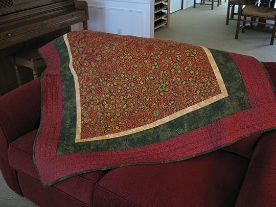 I've been making quilts for quite a few years, and every time I create one, I learn something new. This quilt is called a "One Block Wonder." The secret is to stack six layers of fabric on top of each other, line the patterns up perfectly, and then cut the shapes (triangles) through all the layers. When the six triangles are joined, you have a kaleidoscope effect. It's easier than it sounds. In making this quilt I learned that a fabric with a bigger pattern and with a greater variety of colors would have resulted in a more dramatic look. But I think it turned out nice anyhow.