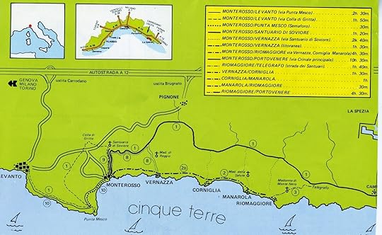 Then several days ago my daughter-in-law loaned me a book - Beautiful Ruins by Jess Walter - and much of the story is set in the Cinque Terre! So I pulled out my photo album from our Italy trip, scanned the film-camera photos, and decided to feature a few of them on today's Saturday Snapshots. I'm focusing on the town of Manarola today, since that's where we stayed. Here's a map to get you oriented.
