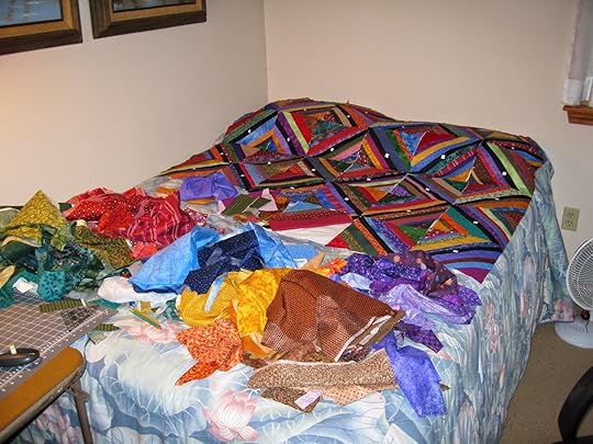 Each square consists of a bunch of odd-sized strips of fabricsewn diagonally across a backing square (a "foundation")