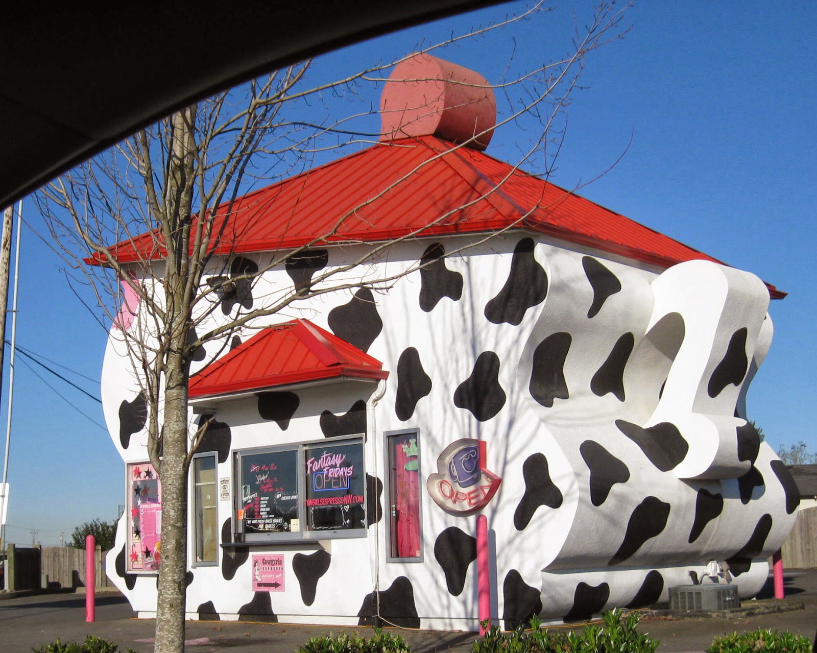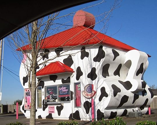 This structure ("Cowgirls Coffee") is actually shaped like a tea kettle (see the handle on the right?)I couldn't get a photo of the whole thing, including the spout, without risking my life in traffic!