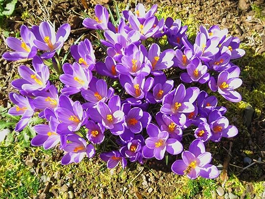 Crocus blooms have disappeared since I took this photo. Notice the bee in the lower right-hand corner?