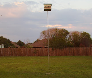 (1) The Purple Martins at our house now have fairly large fledglings. There were originally four pairs of Purple Martins = 8 birds. Each of those pairs had 3-6 eggs which hatched and grew up = 12-24 fledglings. ALL of those birds now occupy the Purple Martin house in our back yard, although they are all off eating bugs somewhere in this photo. Yikes! That is a lot of birds! They are very vocal little critters and are fairly noisy. The other day there were a bunch of them practicing their speed and agility by diving and playing when one of them landed on the ground and just sat there. I'm sure it was one of the babies who was pooped out from all that practice time. Well, all those other birds immediately started chirping and cussing (that's how it sounded to me) and dive bombing that poor tired little critter on the ground until he finally recovered and took off again. This bunch is really entertaining!