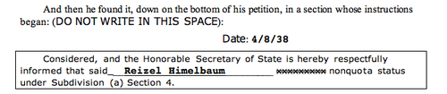 The documents are part of the story. Beholding from the point of view of the immigrant a communication sent by the government of the United States – what the piece of paper looks like, with all its lines and legalese – is a vital part of the immigrant experience.