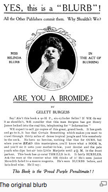 The word “blurb” was coined by American humorist Gelett Burgess in 1907, and actually named after a fictitious young woman he had decided to name Miss Belinda Blurb. There she was on the dust jacket of his book, (see illustration above), promoting its excellence. And, as it were, being described as “in the act of blurbing.”