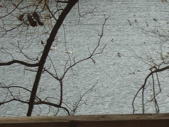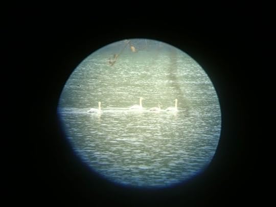 Some of you will remember I love to post my critter counts here at the cabin. We keep a log of all the random animals that happen by, and yesterday we received our most unusual guests so far: four beautiful Trumpeter swans! These birds aren't native to our state and are rarely seen in the South, so this was a wonderful treat. They preened and swam from bank to bank outside our cabin, sunning their wings.