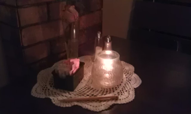 The assignment: Without looking at anyone else's entry, spending no more than ten minutes and 250ish words, and writing in your natural voice, describe this accumulation of objects, and leave your answer in the comments. I know the picture is dark, so I'll list the items included here (in no particular order) in case identification is useful: a pepper shaker; a container of sugar and fake sugar packets; a doily; a glass votive with a lit candle; a mechanical pencil; a salt shaker; and a vase with a rose in it. How you describe, arrange, and elaborate on those objects in prose is entirely up to you.