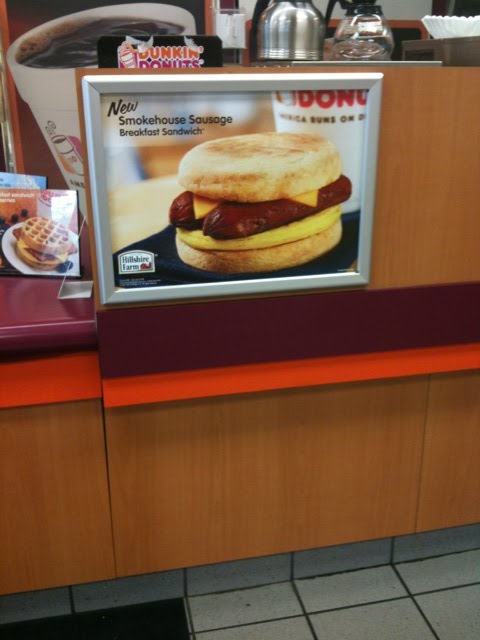 This time it's sausage links inside a sandwich. Were sausage patties which are round and flat and MADE TO FIT INSIDE A SANDWICH making too much sense? This thing is like an egg and cheese pontoon boat. No thanks.