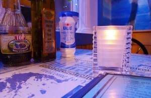 Pookie and I went out last night for Greek food. It was cold and rainy, and the streets of New Paltz seemed to glitter from the melted-down snow and the streetlamps. The restaurant was bright and warm, and everything looked blue–blue maps of Greece and a blue ocean scape painted on the blue walls and blue printed menus. I got pea soup thick as the fog outside and we gossiped and laughed.