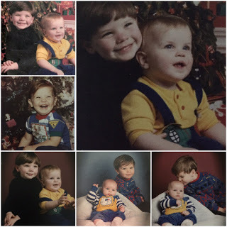The one exception happened around Christmastime. It was 1992. Tim was nearly three, and Jer was a few months old. They were gorgeous kids (still are,) so I made it a point to get those portrait packages whether I could afford them or not. So I dressed them all cute and headed down to Sears for their holiday special. Dan didn't go with me, because he wouldn't, and so I made peace with the fact these photos would just include the kids. Considering their parents were their biggest liability at that point, I figured it was better that way. This drove most of the portraits I kept back then.