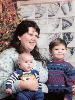 But not Christmas of 1992. Christmas '92, when I took my beautiful boys to the portrait studio, the photographer decided I needed to be a part of it. He asked me to sit for one pose, which I totally didn't want to do. I wasn't dressed for it, for one thing. I think I was even wearing sweat pants, since - all those pounds later - that was pretty much all I could wear back in those days. I had a festive top on, but nothing "portrait" worthy. The last thing I wanted to do was take a photo, especially since Dan wasn't there.