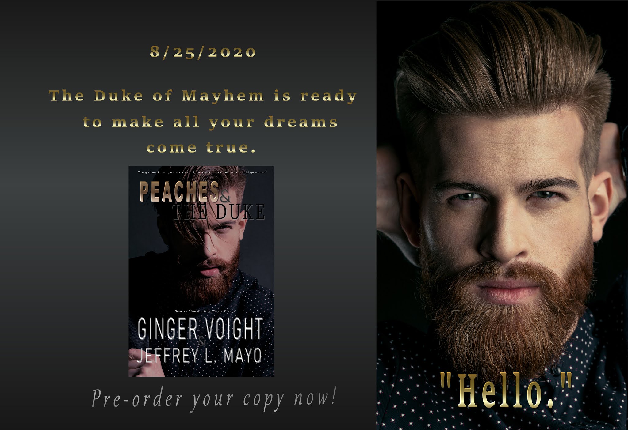 On August 25, 2020, I am so pleased and proud to bring you PEACHES & THE DUKE, my first ever royal fairy tale. It's done Ginger Voight style, which means it has a lot of twists and turns, a few familiar faces, plus a sexy rock star hero to lead the way.