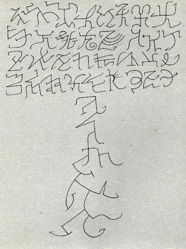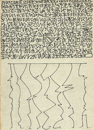 The volume is generous, resembling the Codex Seraphinianus in its commitment. But unlike its predecessor, instead of images, the asemic text is refined down to pure asemia, putting the manuscript in the company of Mirtha Dermisache's graphisms, and the personal interior gestures of Henri Michaux. But unlike the rolling lines of Michaux and Dermisache, Huth's symbols entertain and enlighten with the singularity of their form. The lines of thought and fidgetglyph symbols do spring to life when the book is opened and invite the reader to dance with them in the reader's mind.