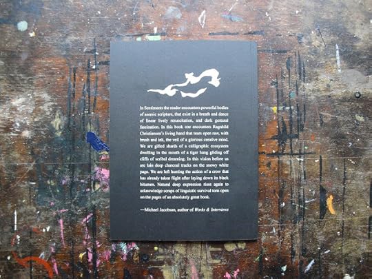 "In Sentiments the reader encounters powerful bodies of asemic scripture, that exist in a breath and dance of linear lively resuscitation, and dark gestural fascination. In this book one encounters Ragnhild Christiansen’s living hand that tears open raw, with brush and ink, the veil of a glorious creative mind. We are gifted shards of a calligraphic ecosystem dwelling in the mouth of a tiger hang gliding off cliffs of scribal dreaming. In this vision before us are lain deep charcoal tracks on the snowy white page. We are left hunting the action of a crow that has already taken flight after laying down its black bitumen. Natural deep expression rises again to acknowledge scraps of linguistic survival torn open on the pages of an absolutely great book."