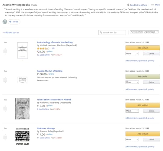 The list features all Post-Asemic Press titles along with asemic books published by other presses. Click here to view the list on Amazon: https://www.amazon.com/hz/wishlist/ls/RCOJWWCHZFSL?&sort=default