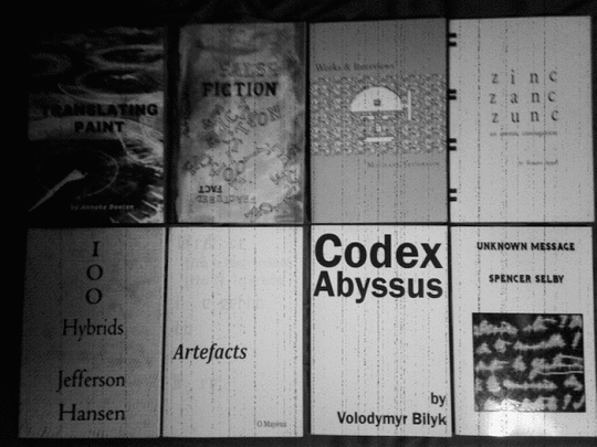 FALSE FICTION FRACTURED FACT ALTERED by Marilyn R. Rosenberg 100 Hybrids by Jefferson Hansen Artefacts by O Mayeux Translating Paint by Anneke Baeten Codex Abyssus by Volodymyr Bilyk Zinc Zanc Zunc: An Asemic Conjugation by Rosaire Appel Unknown Message by Spencer Selby Works & Interviews by Michael Jacobson