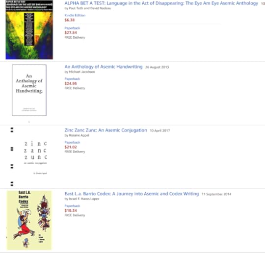 At long last, more asemic writing in Tim Gaze's backyard, the first 5 Post-Asemic Press titles are now available at Amazon in Australia! Goodbye to expensive overseas shipping! Click here for Zinc Zanc Zunc: An Asemic Conjugation by Rosaire Appel: https://www.amazon.com.au/Zinc-Zanc-Zunc-Asemic-Conjugation/dp/1545301824/ref=sr_1_1?s=books&ie=UTF8&qid=1513353322&sr=1-1&keywords=Zinc+Zanc+Zunc Works & Interviews by Michael Jacobson: https://www.amazon.com.au/Works-Interviews-Michael-Jacobson/dp/1544896859/ref=sr_1_1?ie=UTF8&qid=1513353021&sr=8-1&keywords=works+%26+Interviews+Michael+Jacobson Unknown Message by Spencer Selby: https://www.amazon.com.au/Message-Spencer-Selby/dp/1545012768/ref=sr_1_1?s=books&ie=UTF8&qid=1513353381&sr=1-1&keywords=Unknown+Message Codex Abyssus by Volodymyr Bilyk: https://www.amazon.com.au/Codex-Abyssus-Volodymyr-Bilyk/dp/1545599599/ref=sr_1_1?s=books&ie=UTF8&qid=1513353446&sr=1-1&keywords=codex+abyssus Translating Paint by Anneke Baeten: https://www.amazon.com.au/Translating-Paint-Anneke-Baeten/dp/1548080861/ref=sr_1_1?s=books&ie=UTF8&qid=1513353521&sr=1-1&keywords=Translating+Paint Click here for Post-Asemic Press: http://postasemicpress.blogspot.com/
