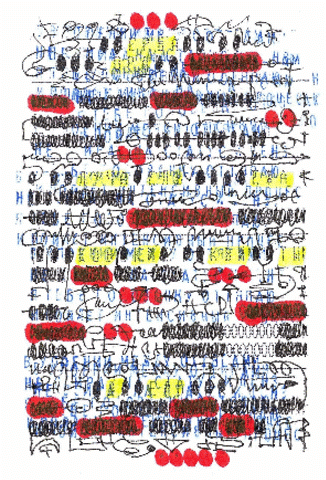 A key, genome, a periodic table showing how paint translates into writing and how writing is visual and gets traced into even further visuals and shifts into newly altered meaning.