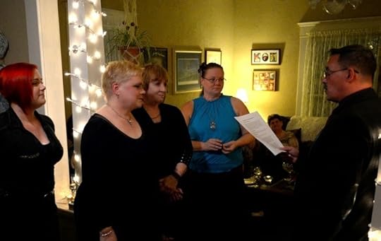 I've been married twice before. Once when I was 18 (which ended with my being widowed eight months later) and once when I was 23 (which ended in divorce after three and a half years). Since 1977 I've shied away from marriage; the cruel realities of it had visited themselves rather harshly on me far too early in life. When I met Lynette marriage just wasn't in the realm of possibility so I never even considered it. I never needed that "piece of paper" to strengthen my commitment to her and our blended family, or to ourselves as a couple and our life together. In 2001 we had a Holy Union ceremony and that was good enough for me. It had to be. Then, earlier this month, Marriage Equality was passed in our state and we decided to take the plunge. We already felt married, but making it legal would grant us all the privileges and protections other couples take for granted as their inherent rights. I know. I did too when I was younger. It wasn't until I realized I'd forfeit my equality that I appreciated all that was wasn't open to me anymore. So two weeks ago we began planning a wedding ceremony to be performed here at Bookends Cottage in the presence of our closest friends and family members.