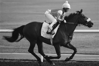 Unless you're a good and intimate friend of mine you wouldn't know that my very first aspiration in life was to be a jockey. I loved horses and, growing up on a ranch in the Santa Ynez Valley and having lots of girlfriends who rode both dressage and western, it wasn't at all unusual that I should lean in this direction. I was never attracted to the local rodeo scene, however, with its barrel racing and such. I wanted the silks...Across the road from the ranch we lived on (we didn't own it, but rented a small house near the barns and cattle/horse corral and breeding pen) sat a boarding stables called Jess Clark Farms, whose clientele was thoroughbreds and race horses. For the entire time that we lived out on Adobe Canyon Road (now Fredensborg Canyon Road ), just the name of Jess Clark struck a blind fear in me. How could I, a 9 year-old horse lover, stay away from Clark's white fences, where his charges grazed on tender green grass, their tails swishing lazily at flies? Huge, sleek, apollonian and proud, they were nearly otherworldly to me. The attraction, as it is for many girls at that age, was overpowering. (Go back to your pipe, Dr. Freud. This was True Love.)