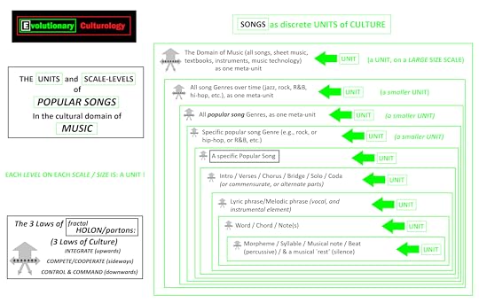 Law #1 – Integration Upwards: Units integrate into larger supersystems (e.g. songs into albums, albums into genres, genres into cultures). Law #2 – Lateral Cooperation and Competition: Units on the same level compete and cooperate with each other (e.g. songs competing for airplay or emotional attention). Law #3 – Command and Control Downwards/Inwards: Each unit directs the scale-level below it (e.g. lyrics influencing thought, mood, or ethics in the listener).