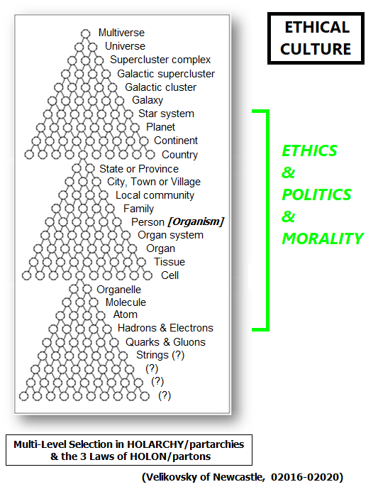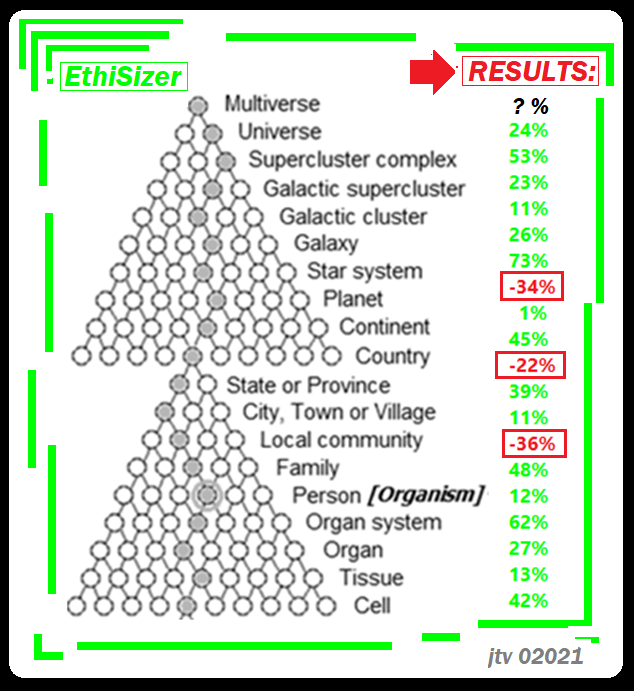 The report (Figure 1 above) shows the beneficial (good!) and deleterious (bad!) ethical effects on various units and levels of the system... Namely, our planet's Ecosystems, i.e., life (plants, animals, humanimals), cells, tissues, organs, organ systems, organisms, families, groups, states, nations, and, the whole planet - all considered as one whole unit. (In fact, as one HOLON/parton.)