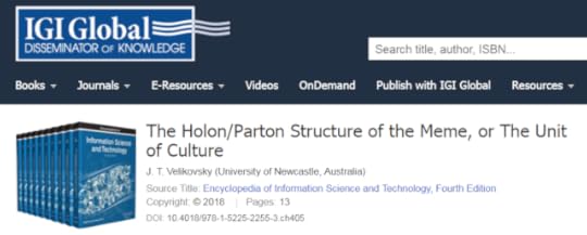 June 2017 - I have a new encyclopedia chapter out: The structure of the meme, the unit of culture, in The Encyclopedia of Information Science and Technology, 4th Edition (Velikovsky 2017).